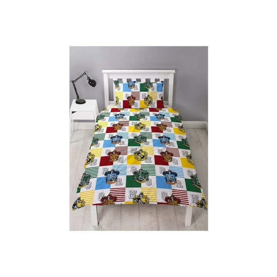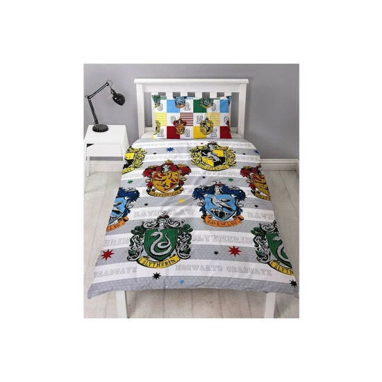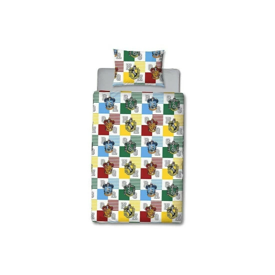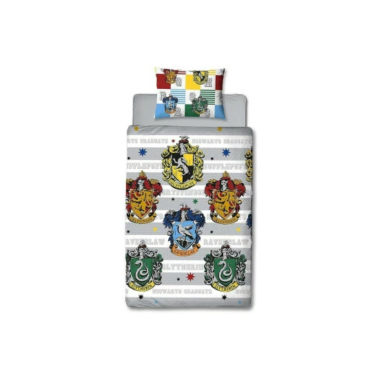 100% Polyester. Contents: 1 Duvet Cover, Pillowcase. Fabric: Microfibre. Design: Gryffindor, Hufflepuff, Ravenclaw, Repeat Print, Slytherin, Stripe. Reversible. 100% Officially Licensed.