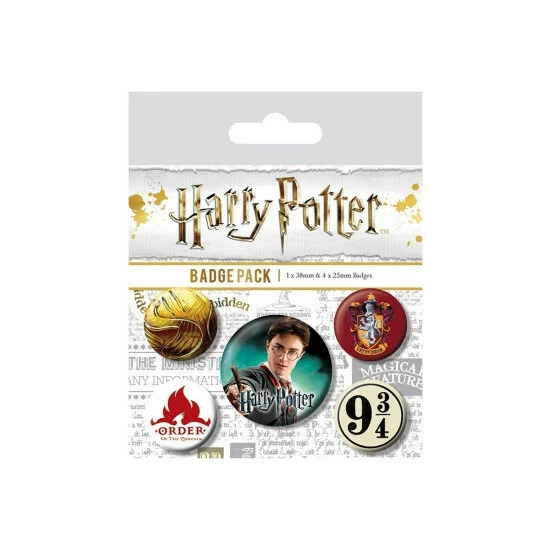 Material: Plastic. Length: 12.5cm. Width: 10cm. Fastening: Pin. Design: Crest, Golden Snitch, Platform 9 3/4, Text. Characters: Harry Potter. 100% Officially Licensed. Contents: 1 x 38mm, 4 x 25mm. Packaging: Display Bag.