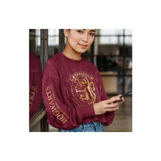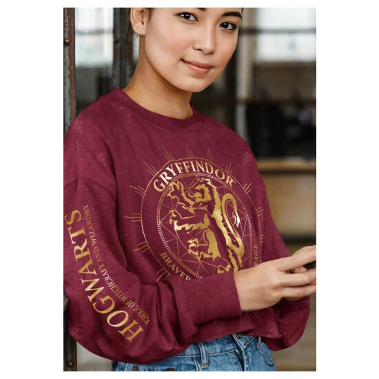 Material: 50% Cotton, 50% Polyester. Design: Acid Wash, Constellation, Gryffindor, Hogwarts. Cropped. Neckline: Crew Neck, Ribbed. Sleeve-Type: Long-Sleeved. Cuff: Ribbed. Fastening: Pull Over. 100% Officially Licensed.