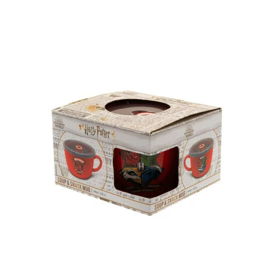 Material: Ceramic, Plastic. Length: 15cm. Width: 14.5cm. Flip-Top Lid. Design: Gryffindor, Hogwarts, Text. Capacity: 600ml. Packaging: Gift Box. 100% Officially Licensed.