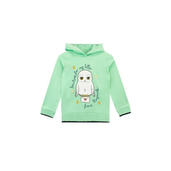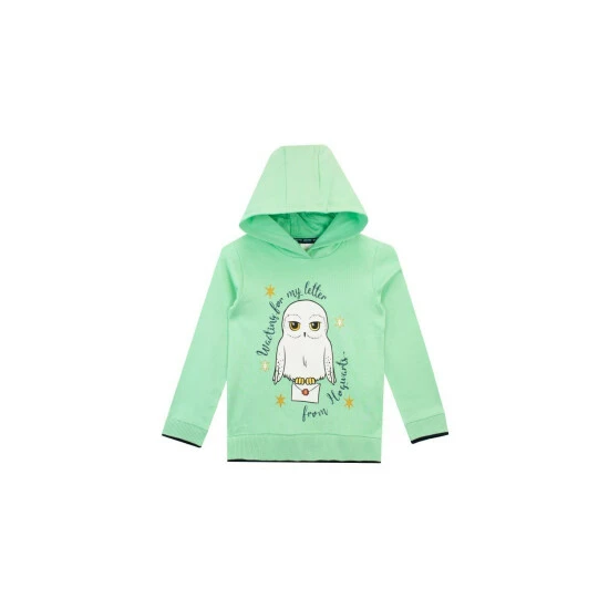 Girls Harry Potter Hoody. Watch out for owls, because that letter from Hogwarts is on its way! This mint green hoody is perfect to wear in the meantime – a print of a cute owl carrying a letter with the slogan ‘Waiting for my letter from Hogwarts’ and surrounded by glittery gold stars, it’s a truly magical hoodie fit for all Hogwarts students!