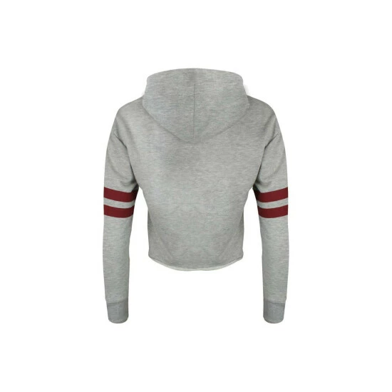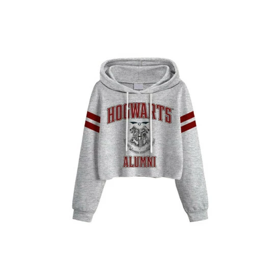 Design: Heathered, Hogwarts Crest, Stripe, Text, Varsity. Cropped. Hood Features: Drawstring. Hem: Raw Edge. Cuff: Fitted. Neckline: Hooded. Sleeve-Type: Long-Sleeved. Fastening: Pull Over. 100% Officially Licensed.