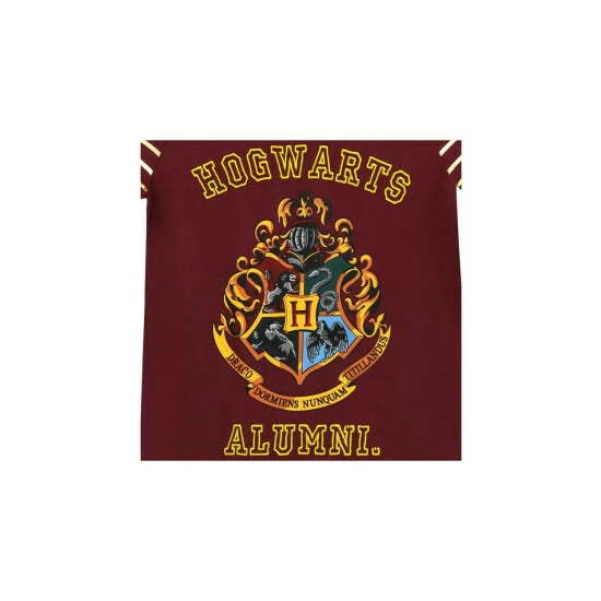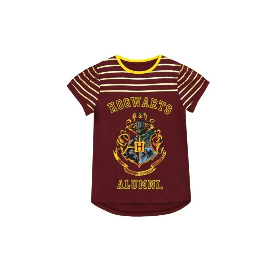 Girls Harry Potter T-shirt. This vibrant burgundy short sleeve top with gold metallic stripes features a large print of the iconic Hogwarts crest as well as ‘Hogwarts Alumni’ in yellow embroidery. With a dipped hem and rolled up sleeves it’s the ideal shirt for all young witches who aim to attend the famous Witchcraft and Wizardry school of Hogwarts. Made of soft 100% cotton, it’ll be the most charming item on their trunks!