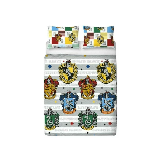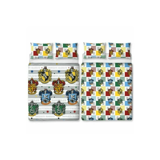 Material: Cotton, Polyester. Contents: Duvet Cover, Pillowcase. Design: Gryffindor, Hufflepuff, Ravenclaw, Reversible, Slytherin. 100% Officially Licensed.