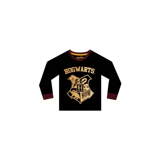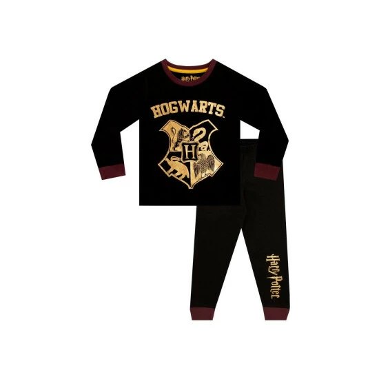 Harry Potter pyjama set from Warner Bros is made of a super soft cotton blend. Magical Hogwarts long sleeved top with metallic gold detail and matching black pyjama bottoms complete with an elasticated waist and cuffs. Soft to wear and easy to care.