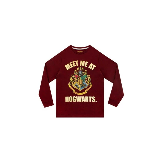 Kids Hogwarts Harry Potter long sleeved pyjamas in burgundy red and grey. This PJ set will have your little wizard dreaming of magic! The top features the Hogwarts School of Witchcraft and Wizardry emblem with ‘Meet Me At Hogwarts’ wording in metallic gold foil. Paired with grey pyjama bottoms that have a motif of Harry Potter’s initials HP. Complete with an elasticated waist and cuffs for cosyness. Crafted in super soft cotton and easy to care for.
