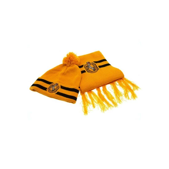 Material: Acrylic. Fabric: Knitted. Scarf (Approx): 120cm Length, 15cm Width. 100% Officially Licensed. Contents: Beanie, Scarf. Design: Crest, House Colours, Hufflepuff, Striped. Pom Pom, Tassel. Packaging: Swing Tag.