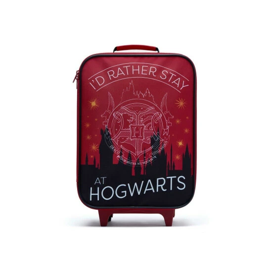 Approximate Dimensions: H: 45 x W: 31 x D: 15 cm. Official licensed Harry Potter merchandise. This cool childrens Harry Potter suitcase makes the perfect trunk for your little wizard or witch to take to Hogwarts! In burgundy red this luggage bag for children features the Hogwarts crest in silhouette with the slogan ‘Id Rather Stay At Hogwarts’. Ideal for sleepovers, school, travel this bag has wheels, an extendable handle and an elastic strap on the inside to securely hold all their belongings.