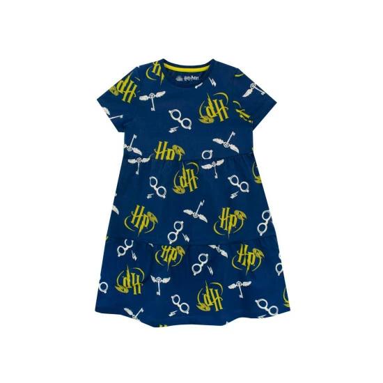 Get your little wizard ready for a world of magic in this cute Harry Potter dress. This navy dress features an all over print of the snitch, winged keys, Harry Potter initials and Harry Potter’s glasses and scar. In this smocked style dress with yellow and white motifs, your wizard will be set for spells and adventure.