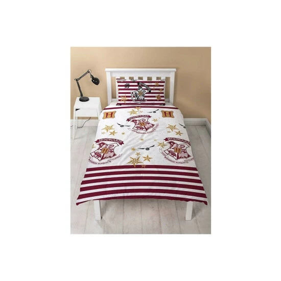 100% Polyester Microfibre. Contents: Duvet Cover, Pillowcase. Design: Hogwarts Crest, Repeat Print, Stars, Striped, Text. Reversible. 100% Officially Licensed.