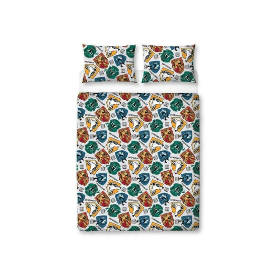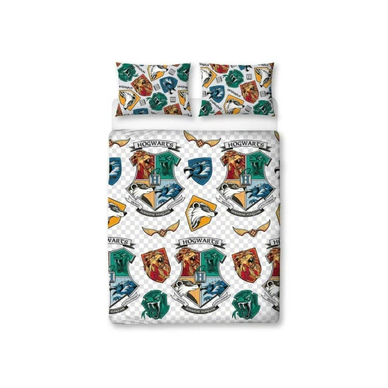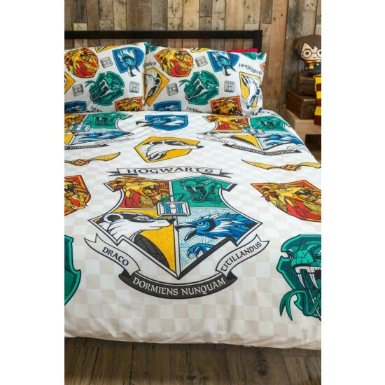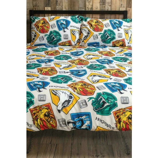 100% Polyester Microfibre. Contents: Duvet Cover, Pillowcase. Design: Crest, Grid, Hogwarts Houses, Reversible. 100% Officially Licensed. Fabric Technology: Durable, Quick Dry, Soft.