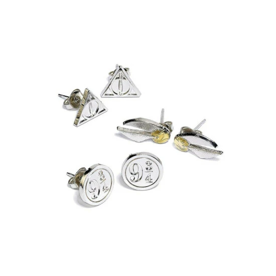Material: silver plated. Includes Golden Snitch, Deathly Hallows and 9 and 3/4 stud earrings. On a backing card. Official licensed product. Size for all approx: 10mm x 10mm.