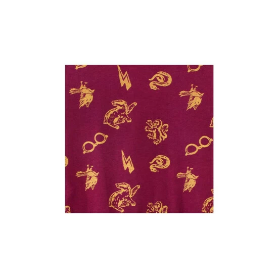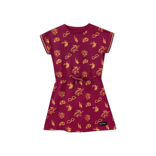 Girls Harry Potter Dress. This enchanting short sleeve dress in Gryffindor’s signature burgundy has a bow to the centre of the waist and features an all over print of Hufflepuff’s badger, Slytherin’s snake, Gryffindor’s lion and Ravenclaw’s eagle as well as Harry’s glasses and scar all in shimmery gold glitter. A must have outfit for your little witch’s trunk.
